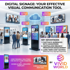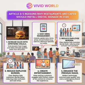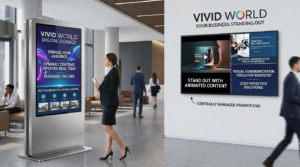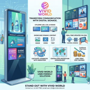 Vivid World เรานำเสนอระบบ Digital Signage ที่ใช้งานง่าย รองรับทั้งแบบตั้งพื้น (Kiosk) และแบบติดผนัง พร้อมบริการวางระบบให้ธุรกิจของคุณโดดเด่นกว่าใคร