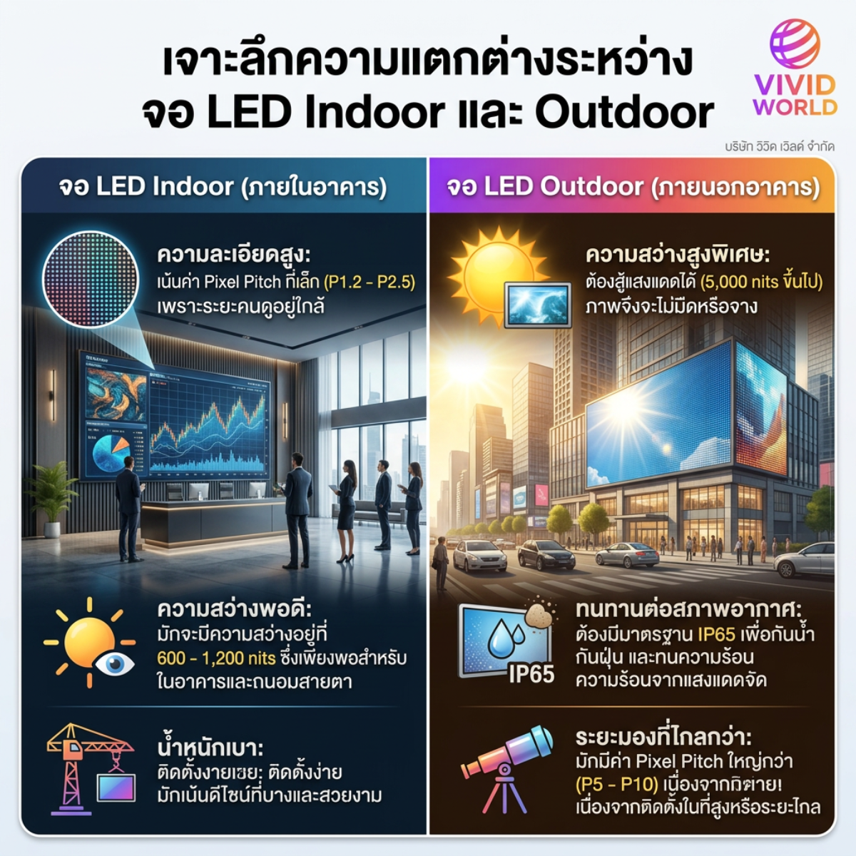 การลงทุนติดตั้งจอ LED มีมูลค่าสูง ดังนั้นการเลือกประเภทจอให้ถูกกับหน้างานจึงสำคัญมาก บริษัท วิวิด เวิลด์ จำกัด ขอสรุปความแตกต่างหลักๆ ดังนี้: